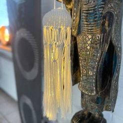 Dieser bezaubernde Makramee-Lampion im Quallendesign verleiht jedem Raum eine zauberhafte und stimmungsvolle Atmosphäre. Das handgefertigte Kunstwerk vereint die filigrane Knotentechnik des Makramees mit einem kreativen Design, das an die Anmut einer Qualle erinnert. Der Lampion ist mit einer kleinen Draht-Lichterkette im Inneren ausgestattet und strahlt sanfte Lichtpunkte aus, die durch das Makrameegarn hindurch scheinen und so ein warmes, einladendes Licht erzeugen. Ideal für gemütliche Abende, festliche Anlässe oder als stilvolle Dekoration in deinem Zuhause – dieser Makramee-Lampion zieht mit seinem charmanten Design und dem geheimnisvollen Licht die Blicke auf sich. Schaffe mit diesem Makramee-Lampion eine magische Stimmung, lass dich von der einzigartigen Kombination aus Handwerkskunst und Licht inspirieren und genieße die beruhigende Atmosphäre und bringe ein Stück Natur in dein Zuhause. Wähle zwischen 3 Designs: