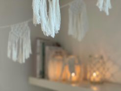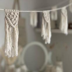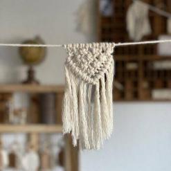 Entdecke diese bezaubernde Makramee-Wimpelkette, die jedem Raum eine einladende Atmosphäre verleiht. Diese handgefertigte Dekoration besteht aus kunstvoll geknüpften Wimpeln und die Wimpelkette eignet sich perfekt für verschiedene Anlässe, sei es für eine Hochzeitsfeier oder einfach zur Verschönerung deines Wohnraumes. Die filigranen Knotentechniken des Makramees sorgen für eine einzigartige Textur und verleihen der Wimpelkette einen charmanten, boho-inspirierten Look. Ob an der Wand, über einem Bett, über dem Kamin oder als Teil einer festlichen Dekoration – diese Wimpelkette wird zum Blickfang und bringt Freude und Gemütlichkeit in dein Zuhause. Lass dich von der Gestaltung und der Handwerkskunst inspirieren und setze mit dieser liebevoll gestalteten Makramee-Wimpelkette individuelle Akzente in deinem Wohnraum oder auf deiner Festivität!