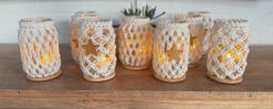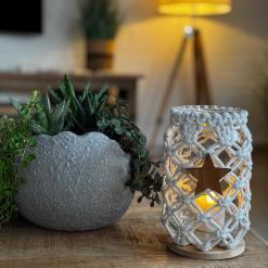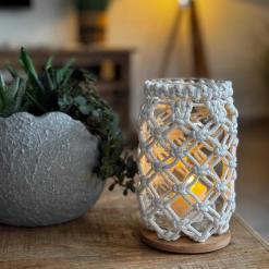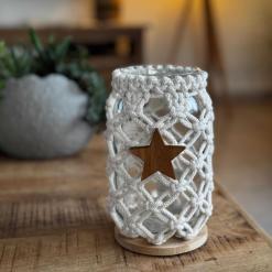 Dieses bezaubernde Makramee-Windlicht im Netz-Design, hergestellt aus dickem, geflochtenem Garn, bringt eine rustikale und dennoch elegante Note in dein Zuhause. Es besteht zu 100 % aus natürlichen Materialien und das Netzmuster schafft eine gemütliche Atmosphäre, während der Bambusuntersetzer dem Windlicht zusätzliche Stabilität und eine natürliche Ästhetik verleiht. Ein geknüpfter Kranz am Glasrand rundet das Design ab. Perfekt für entspannende Momente oder als stilvolles Geschenk für deine Liebsten – mit diesem besonderen Stück schaffst du eine einladende und warme Atmosphäre in jedem Raum. Hol dir dieses einzigartige Makramee-Windlicht und bringe Licht und Liebe in dein Zuhause! Wähle aus zwei Designoptionen: Das pure Windlicht, welches einen Hauch von Urlaubsatmosphäre versprüht. Oder bringe mit dem stilvollen Holzstern ein tolles Boho-Windlicht in Deine Weihnachtszeit.